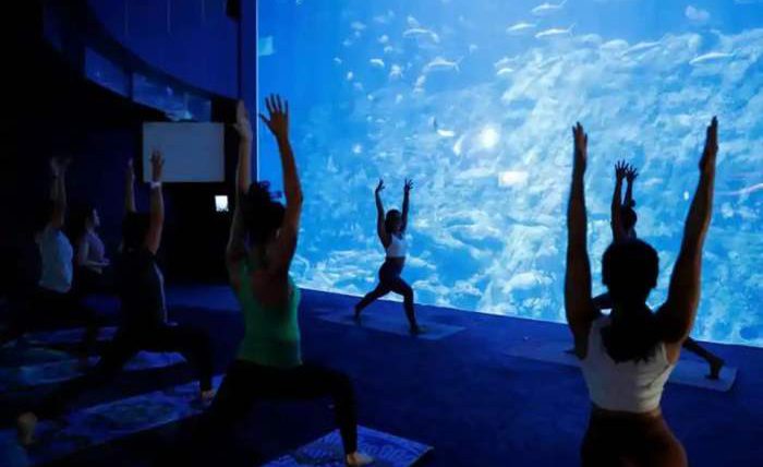 На ярком фоне гигантского аквариума, заполненного акулами, мантами и другими водными обитателями, группа выполняет свои занятия йогой, сообщает kratko-news.com.